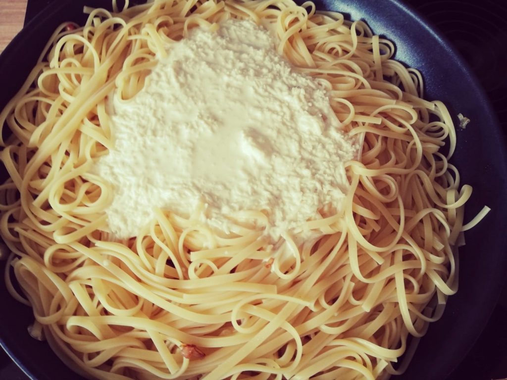 Wenn die Nudeln bissfest sind, diese abschütten und direkt mit in die Pfanne geben sowie die Sauce darüber geben und alles miteinander vermischen.