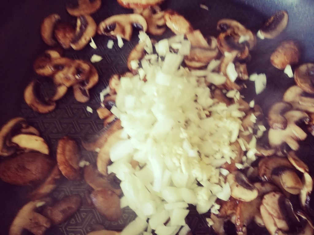Zuerst die Pilze putzen. Mit einer Pilzbürste oder einem Küchenkrepp. Den Stiel soweit kürzen, dass die braunen Stellen weg sind. In dünne Scheiben schneiden und mit Sonnenblumenöl anbraten. Während die Champignons in der Pfanne sind, die Zwiebel und den Knoblauch sehr klein schneiden. Erst wenn die Champignons schon etwas kross gebraten sind, Beides hinzufügen.