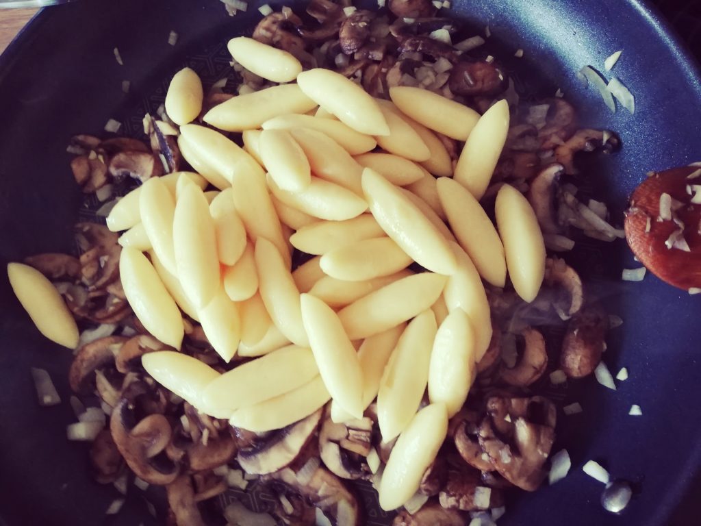 Sobald die Zwiebeln glasig geworden sind, können die Schupfnudeln dazugegeben werden.