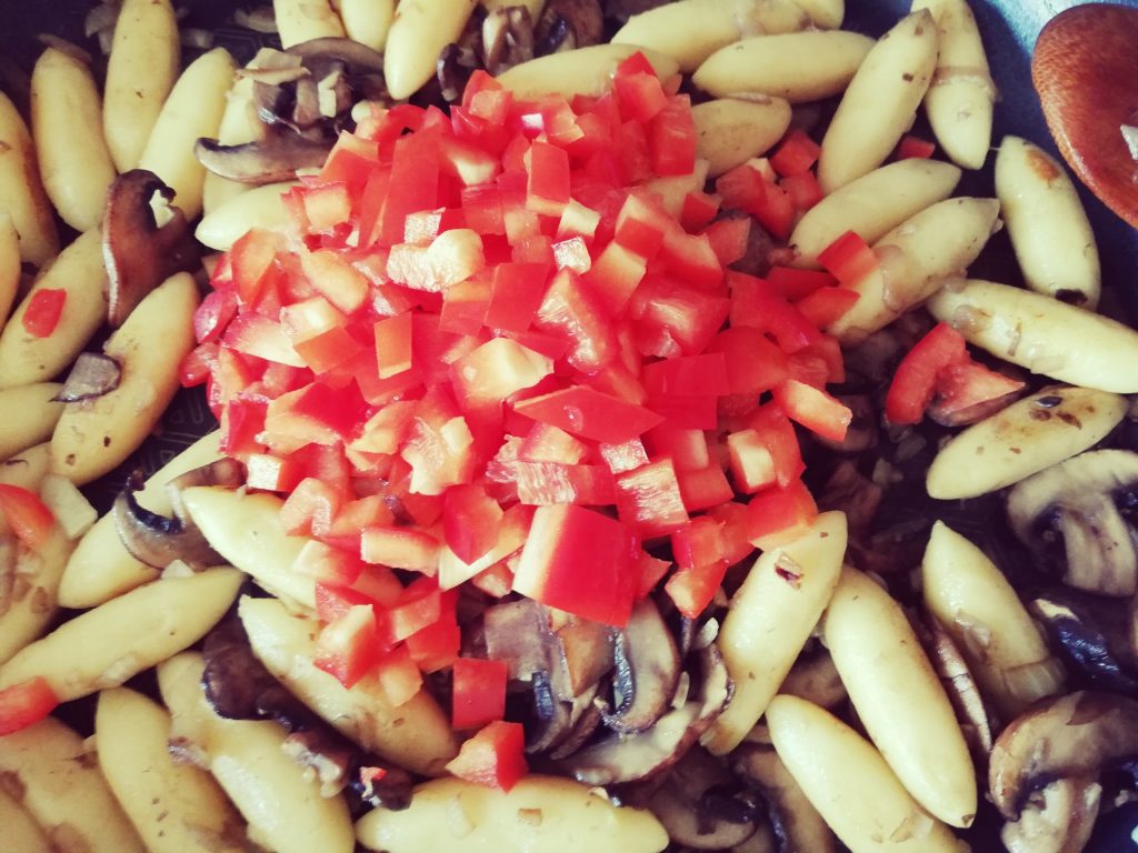 Auch die Schupfnudeln sollten schon braun werden. Währenddessen die Paprika in kleine Stücke schneiden.