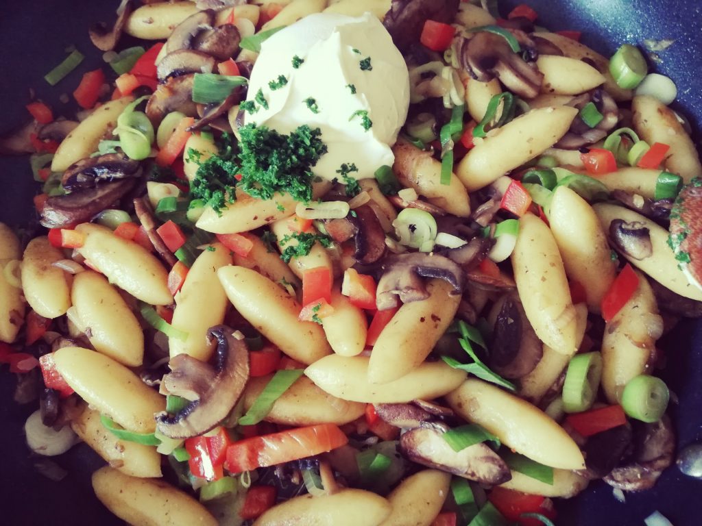 Nun die Frühlingszwiebeln in dünne Streifen schneiden und dann zu den restlichen Zutaten geben. Alles nochmal kurz anbraten, würzen und am Ende Creme Fraîche und Petersilie hineinrühren.