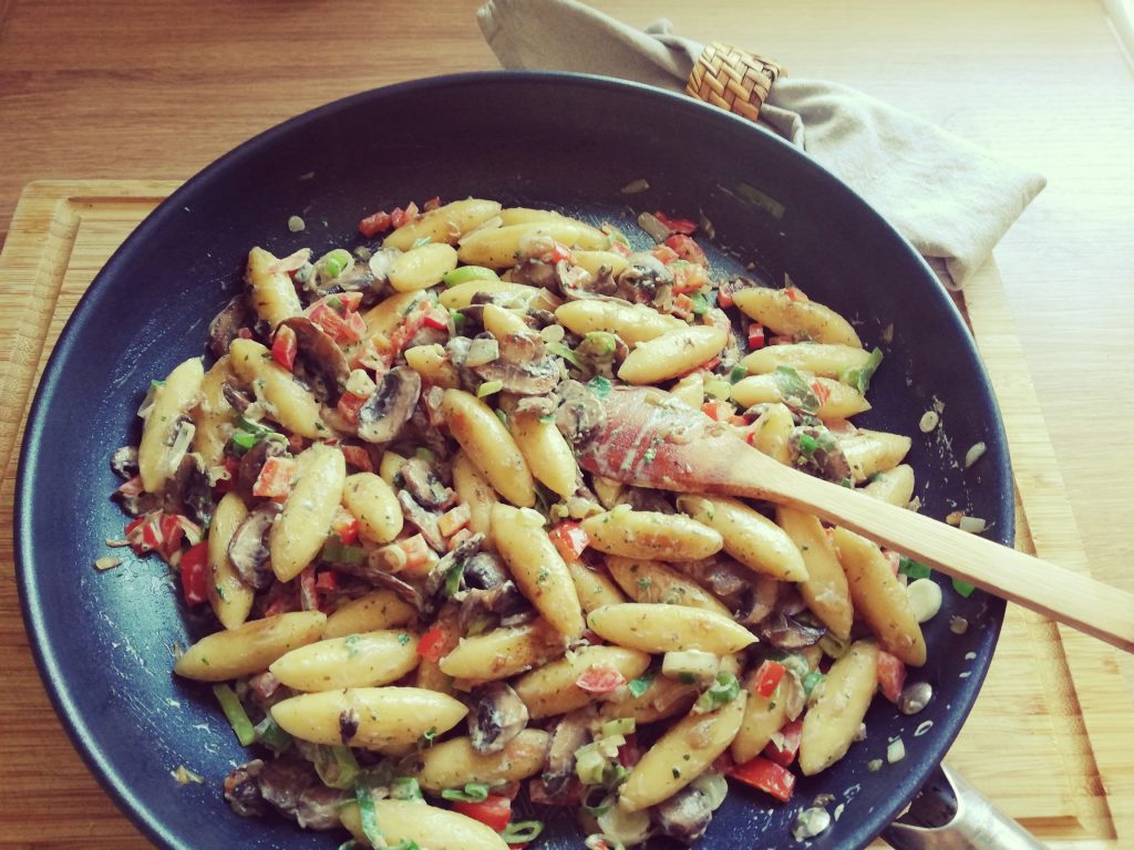 Mal wieder kaum Zeit und trotzdem was leckeres zum Essen zaubern? Das hatte ich heute mal wieder, da mein Sohnemann (6 Monate alt) eine schöne Erkältung hat und ich ihn deshalb keine Sekunde ablegen durfte. Deshalb wurde die Trage angezogen und mit ihm gekocht. Dann muss es aber besonders schnell gehen. Dafür eignet sich diese Schupnudelpfanne besonders gut und allen hat es super geschmeckt. Was ein Lichtblick an diesem Tag 😀