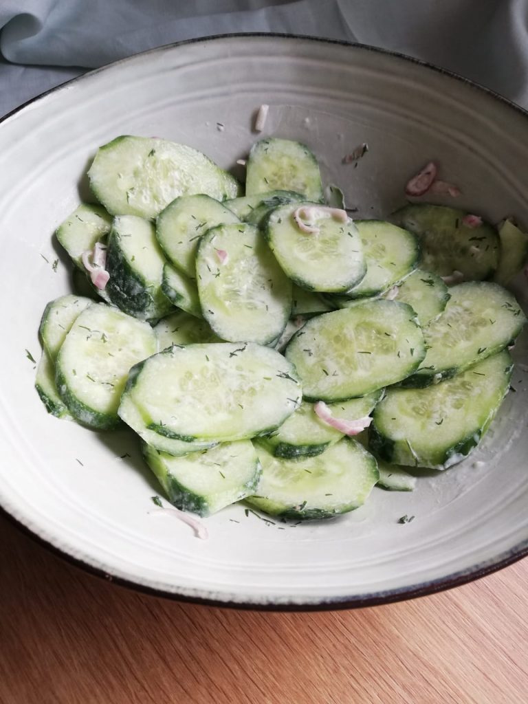 Die Gurke am Besten in sehr feine Streifen schneiden oder eine Reibe dafür verwenden. Die Schalotte ebenfalls sehr klein schneiden und die Gurke mit den Zwiebeln und den restlichen Zutaten vermischen und fertig ist ein super leckerer Gurkensalat.