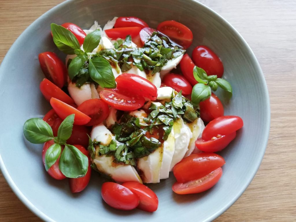 Bis auf ein paar Blätter zum Dekorieren, kann der Basilikum gehackt werden. Den Knoblauch pressen und zusammen mit den restlichen Zutaten zu einer Vinaigrette verrühren. Dann über den Mozzarella geben und schon habt ihr einen tollen Salat.