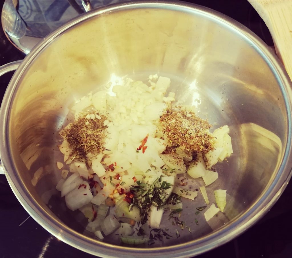 Das Olivenöl erhitzen und darin die Zwiebeln, den Knoblauch, den gehackten Rosmarin, Thymian, Oregano und die gehackte Peperoni dünsten.