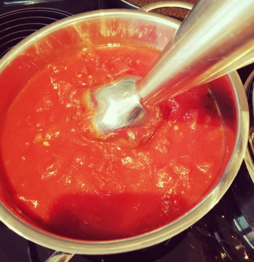Durchgehend rühren und nach zwei Minuten die gehackten Tomaten dazugeben. Mit einem Pürierstab pürieren.