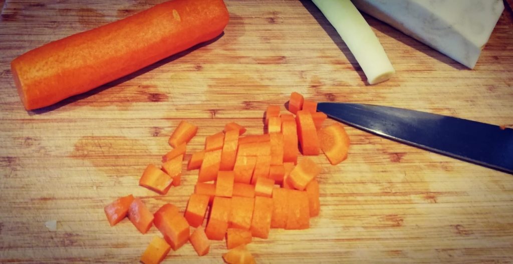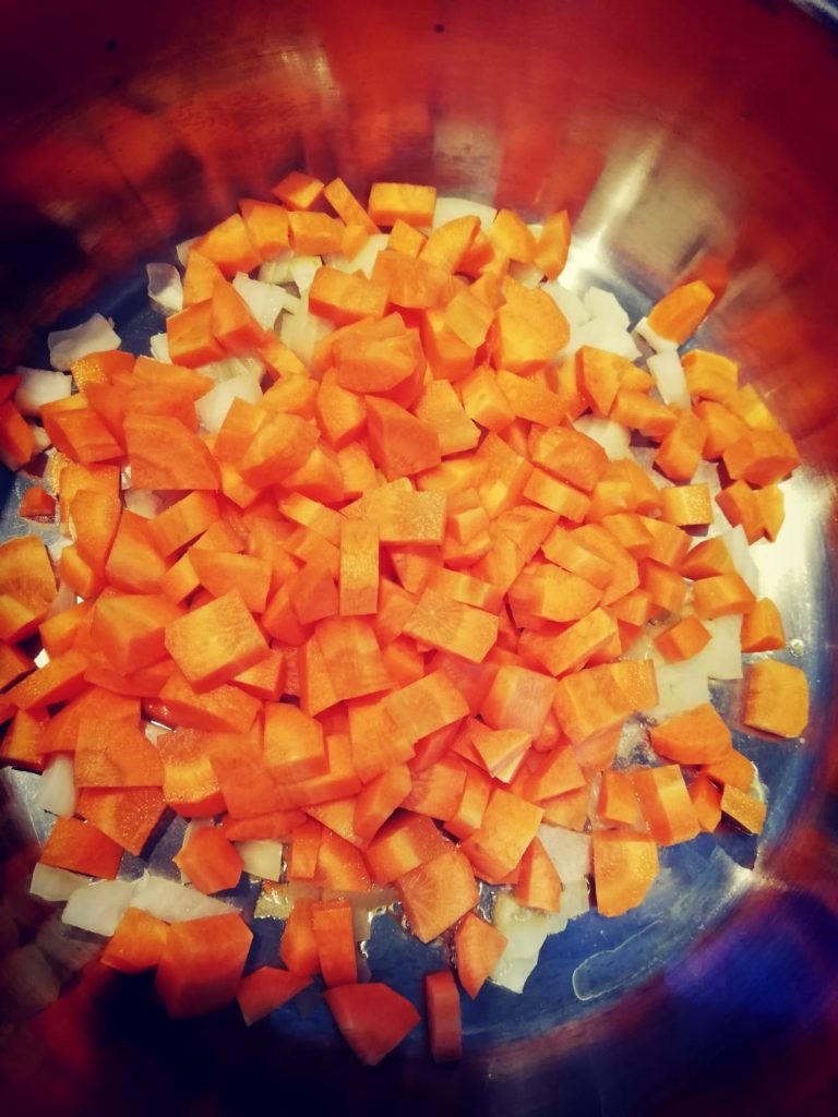 Dann nehme ich ein Stück Butter, lasse diese erhitzen und schneide währenddessen die Zwiebeln in kleine Stücke. Diese werden als erstes zu der Butter hinzugefügt. Dann auf mittlere Hitze reduzieren und die Möhren in kleine Stücke schneiden: