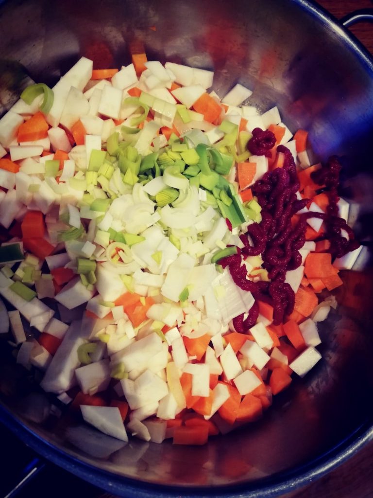 Wenn das Ganze etwas Farbe bekommen hat, füge ich Wasser hinzu bis das Gemüse bedeckt ist. Während das Gemüse anfängt zu blubbern, schneide ich die restlichen Zutaten. Also in meinem Fall Kartoffeln, Kohlrabi und Bohnen.