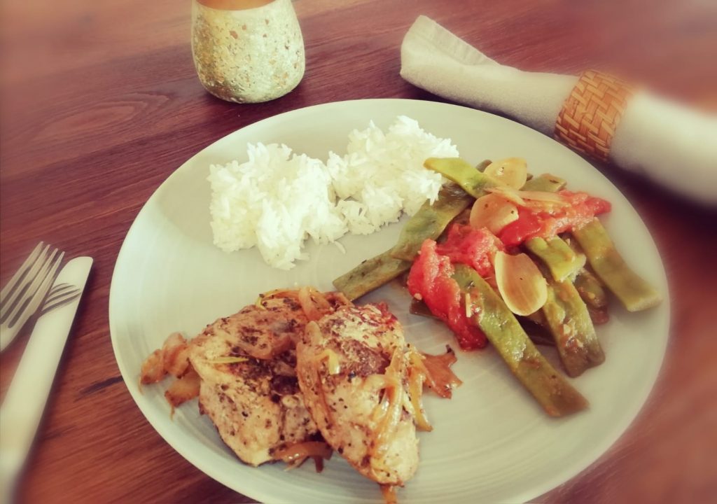 Habe nur ein Bild mit Beilagen (Hier geht es zu dem Gemüse Bohnen in Tomaten):